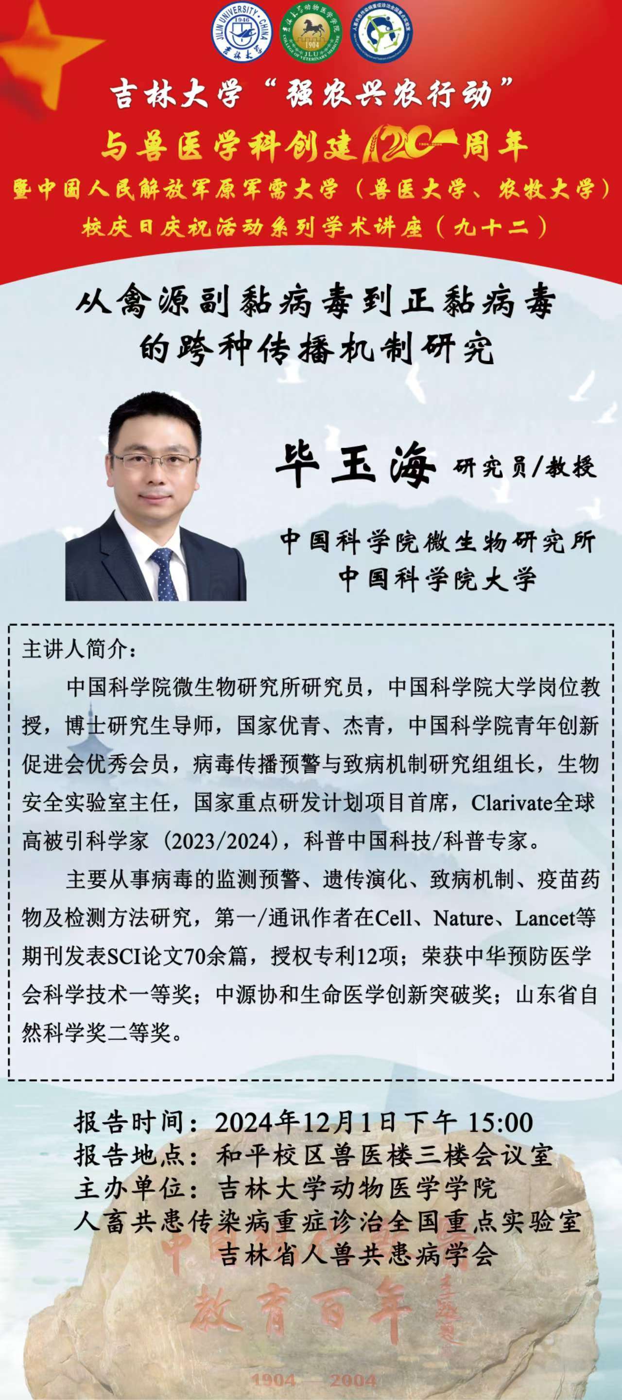 EMC易倍官网“强农兴农行动”与兽医学科创建120周年暨中国人民解放军原军需大学(兽医大学、农牧大学)校庆日庆祝活动系列学术讲座(九十二)
