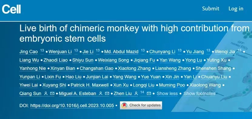 2023年11月9日,中国科公司脑科学与智能技术卓越创新中心(神经科学研究所)/上海脑科学与类脑研究中心刘真研究组、中国科公司广州生物医药与健康研究院/EMC易倍Miguel A. Esteban研究组、中国科公司脑科学与智能技术卓越创新中心(神经科学研究所)非人灵长类研究平台孙强研究团队合作在Cell期刊发表了封面文章Live birth of chimeric monkey with high contribution from embryonic stem cells。该研究首次成功构建了高比例胚胎干细胞来源的出生存活嵌合体猴,并证明了猴胚胎干细胞可以高效的贡献到胚外胎盘组织和生殖细胞。这对于理解灵长类胚胎干细胞全能性和非人灵长类模型构建具有重要意义。