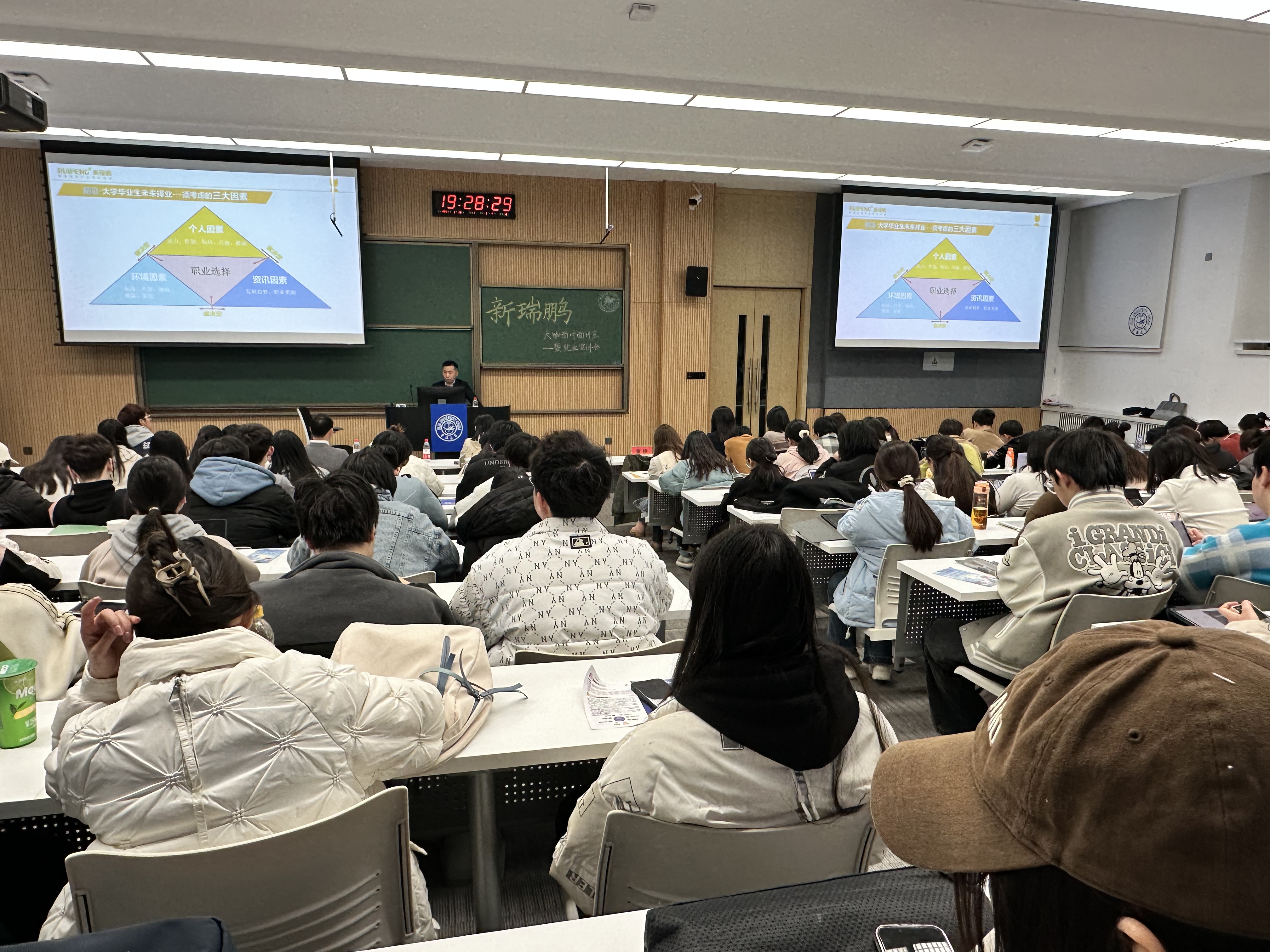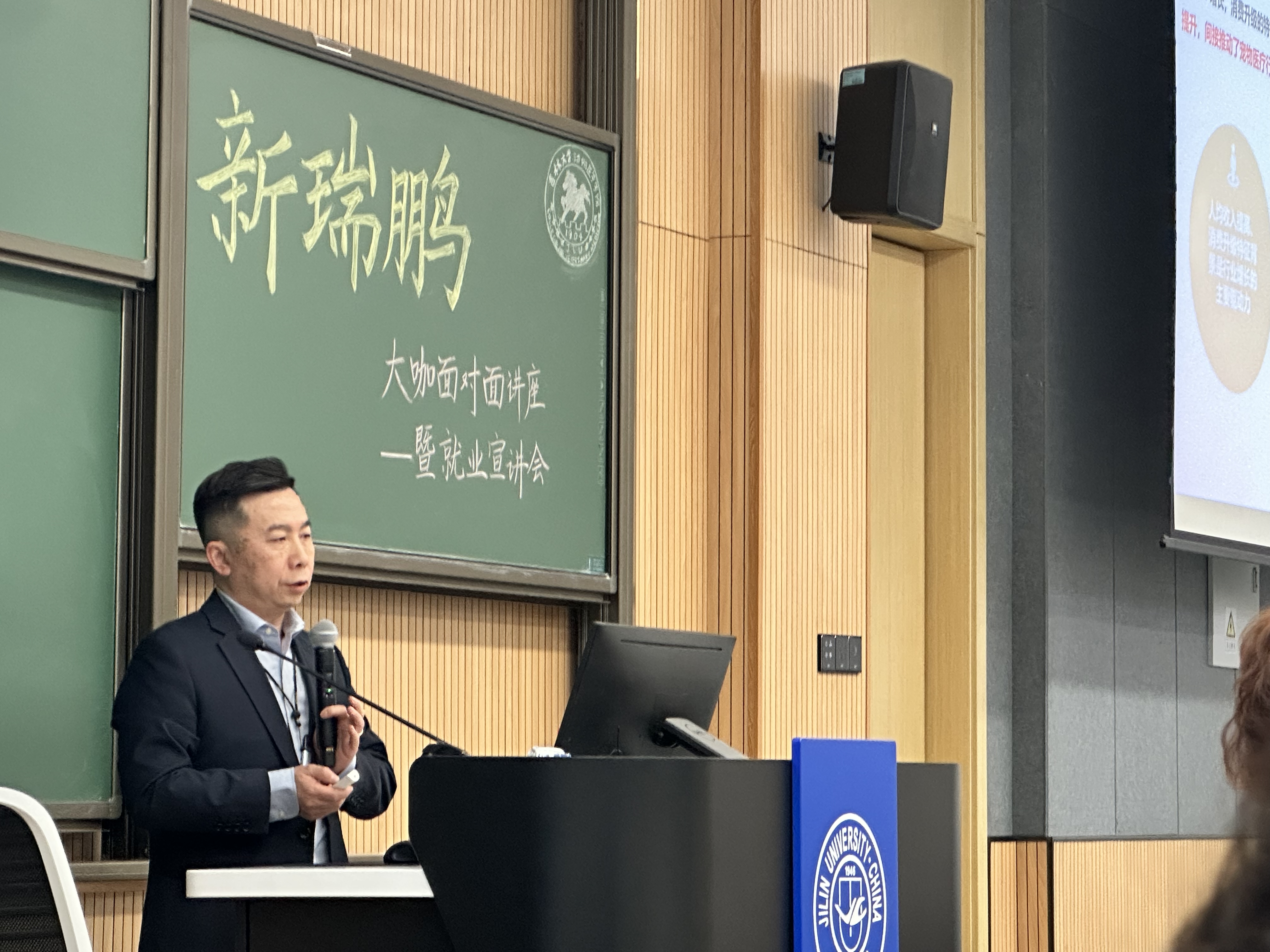 董轶是新瑞鹏宠物医疗集团副总裁,中国农业大学兽医临床博士,芭比堂动物医院连锁机构创始人,国内首席动物眼科专家。首先,董轶博士进行行业知识讲座,他从分享自身经历入题,通过问答等方式与在座互动,针对同学们关注的话题展开讲述。他向同学们讲述了宠物医疗行业的发展历程、现状和新趋势,针对如何成为优秀兽医,董轶博士指出需要员工学好“专业基础知识”、具备“学习、加工、应用专业知识”的能力,随人工智能、大数据分析、远程医疗等技术的不断发展,宠物医疗领域也正逐渐迎来科技的革新,他希望同学们抓住发展机遇,勇敢选择宠物医疗行业作为自己的职业。随后,大湾区与东北区两位招聘主管分别就两区宠物医院分布、行业发展情况向同学们进行了宣讲,希望同学们投身宠物医疗行业。