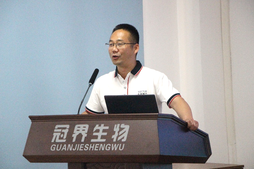 随后,技术中心禽苗研究室主任李俊辉向员工们详细介绍了吉林冠界生物技术有限公司的基本情况,包括公司的主要产品、员工福利和企业文化等。他指出,公司始终秉持创新、诚信、合作和责任的核心价值观,致力于推动生物技术的进步和应用。