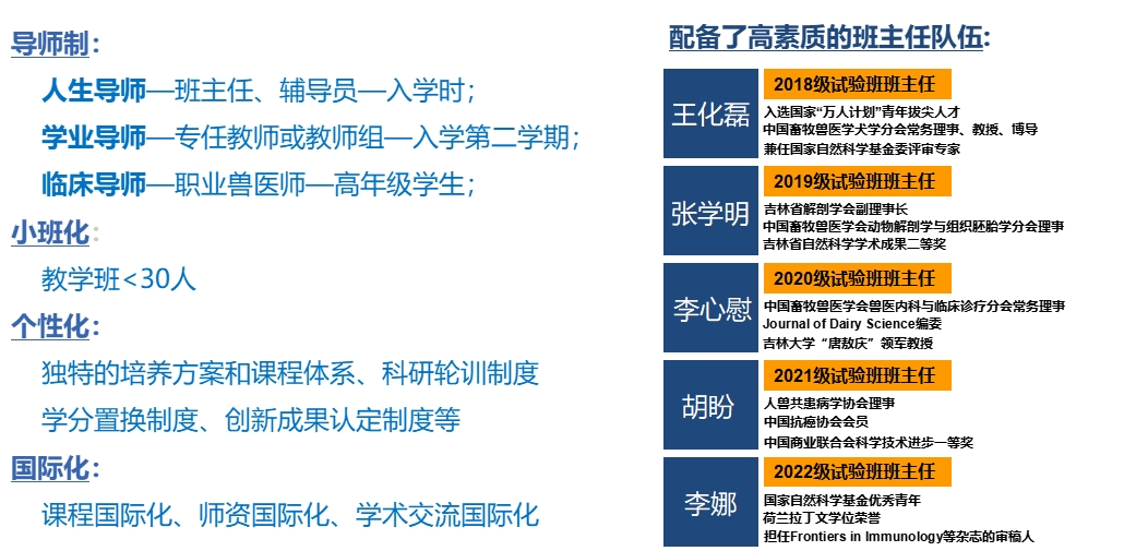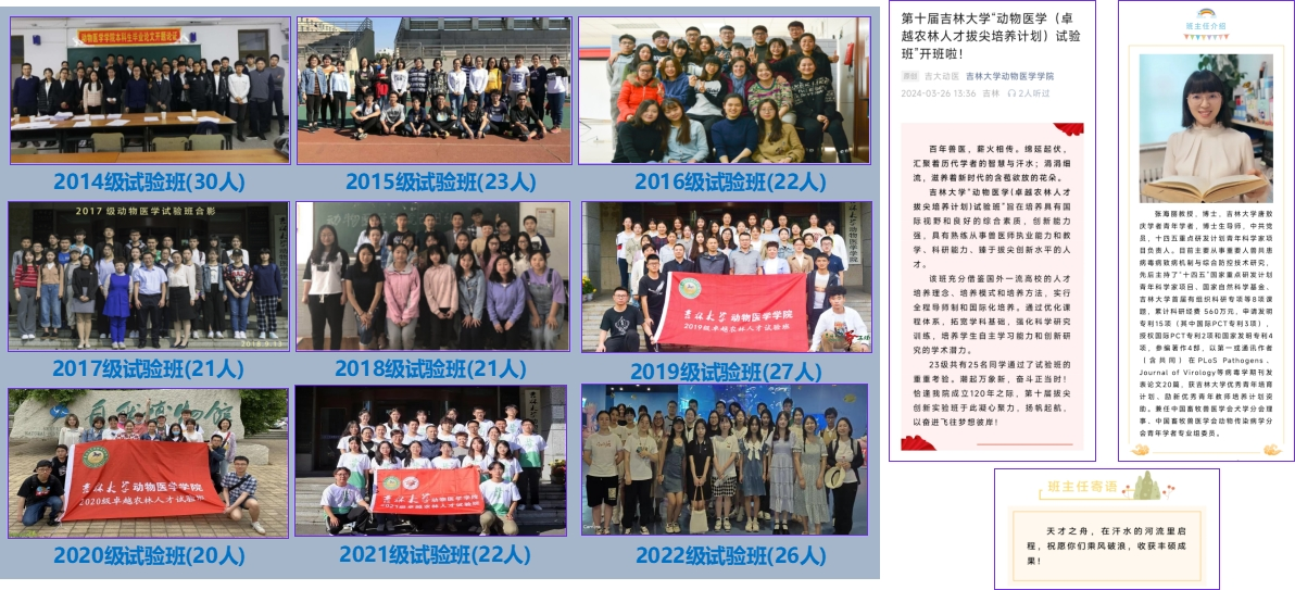 2014年试办卓越人才培养试验班,实行“一制三化”:导师制、小班化、个性化、国际化,现组建10期,累计237名员工,目前读研率为98%,出国交流率41%,科研参与率100%,发表SCI论文影响因子总数154.95,获国家级竞赛奖项59项。以2024届动物医学(卓越农林人才拔尖培养计划)试验班为例,班级27名员工,英语四六级通过率为100%,85%的同学被推免到清华、北大、中科院等双一流A类大学或科研院所,2人入选DVM项目,班级被评为“2023年EMC易倍官网十佳班级”。
