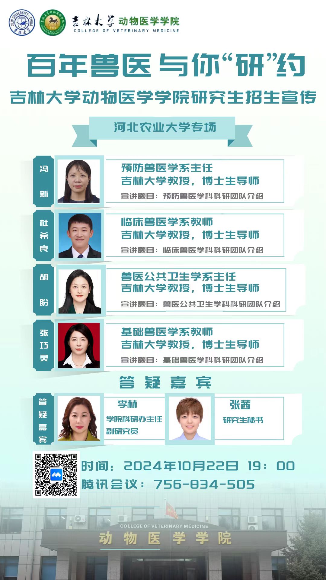 2024年10月22日晚上19:00,EMC易倍成功举办了EMC易倍在线上成功举办了2024年研究生招生宣传——河北农业大学专场活动。参加本次活动的有预防兽医学系主任冯新教授、兽医公共卫生学系主任胡盼教授、基础兽医学系张巧灵教授、临床兽医学系杜希良教授,以及研究生办主任李赫和研究生秘书张茜老师。